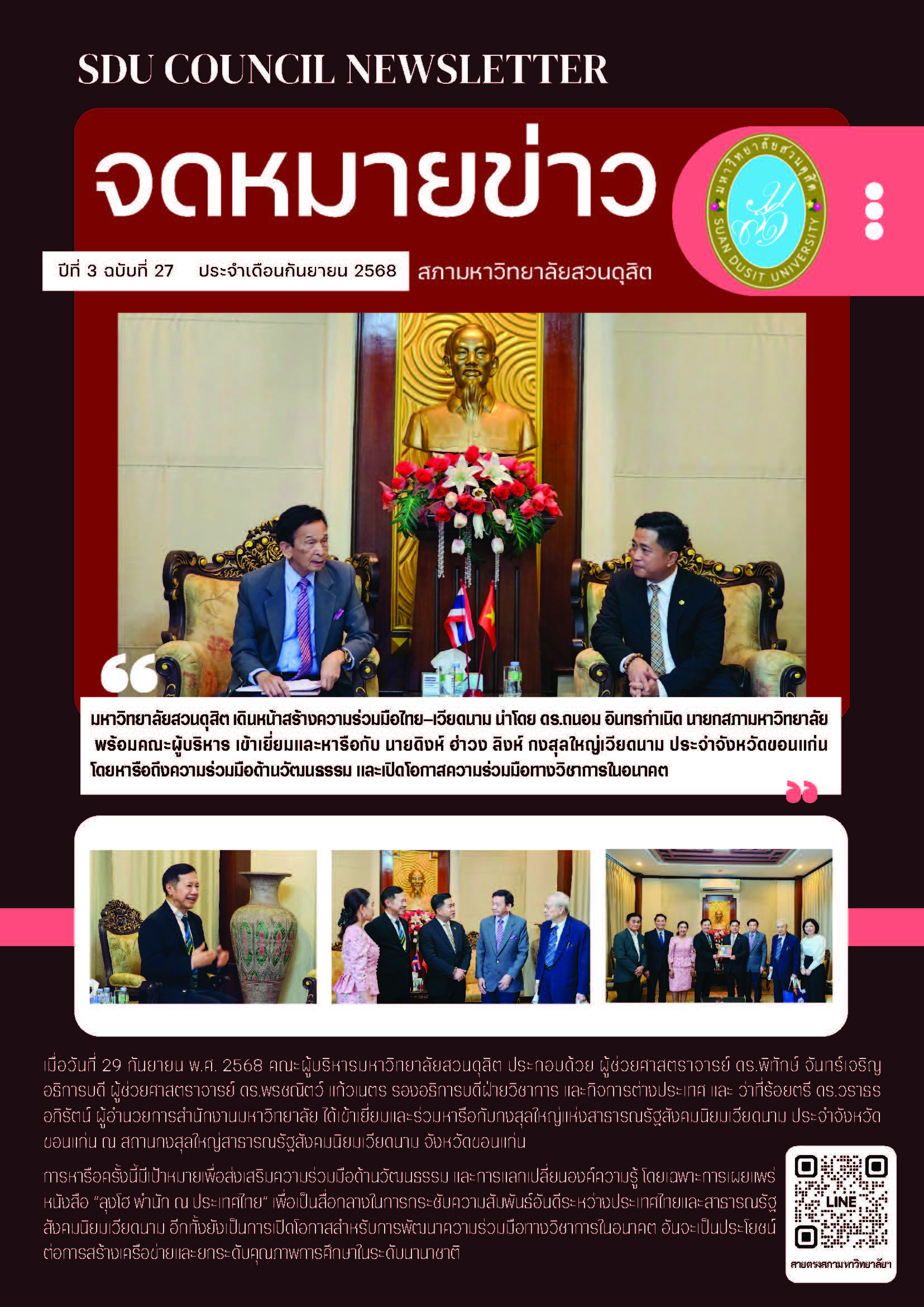 นายกสภามหาวิทยาลัยและผู้บริหารมหาวิทยาลัยสวนดุสิต เข้าเยี่ยมและหารือความร่วมมือกับกงสุลใหญ่เวียดนาม ประจำจังหวัดขอนแก่น เมื่อวันที่ 29 กันยายน พ.ศ. 2568 September 30, 2025 อ่านเพิ่มเติม