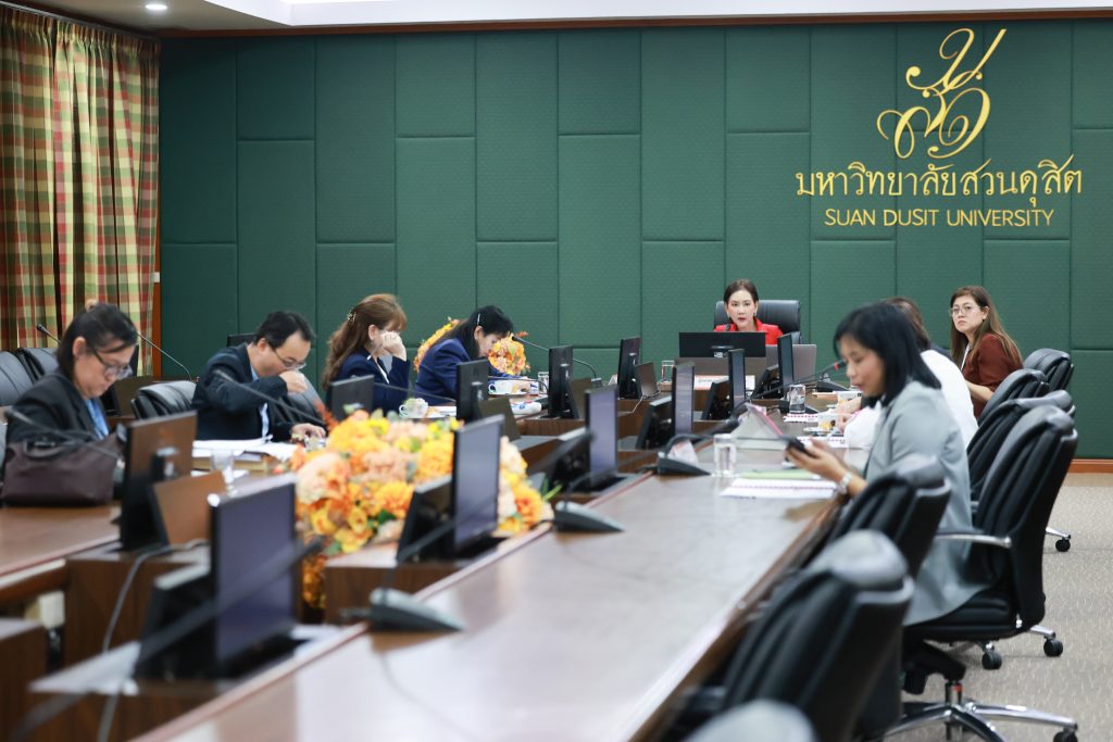 ผู้ช่วยศาสตราจารย์ ดร.พรชณิตว์ แก้วเนตร รองอธิการบดีฝ่ายวิชาการและกิจการต่างประเทศ มหาวิทยาลัยสวนดุสิต เป็นประธานการประชุมคณะกรรมการสรรหาคณบดีบัณฑิตวิทยาลัย ครั้งที่ 3/2568 โดยมีเรื่องนำเสนอเพื่อพิจารณา การแสดงวิสัยทัศน์และพิจารณาเอกสารประกอบของผู้มีสิทธิ์เข้ารับการสรรหาเป็นคณบดีบัณฑิตวิทยาลัย การพิจารณาคัดเลือกบุคคลผู้มีคุณสมบัติตามประกาศคณะกรรมการสรรหาคณบดีบัณฑิตวิทยาลัย เรื่อง ผู้มีสิทธิ์เข้ารับการสรรหาเป็นคณบดีบันฑิตวิทยาลัยประกาศ ณ เมื่อวันที่ 21 สิงหาคม พ.ศ. 256 ฯลฯ ณ ห้องประชุม Café by home มหาวิทยาลัยสวนดุสิต